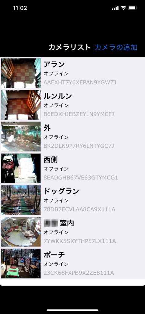 こちらがアプリの画面。うちは全部で7台を設置しています。上4つが実家、下3つは別の家です。アプリ内で複数のカメラを管理できるためとても便利。見たいカメラをタップすると個々のカメラに切り替わります。